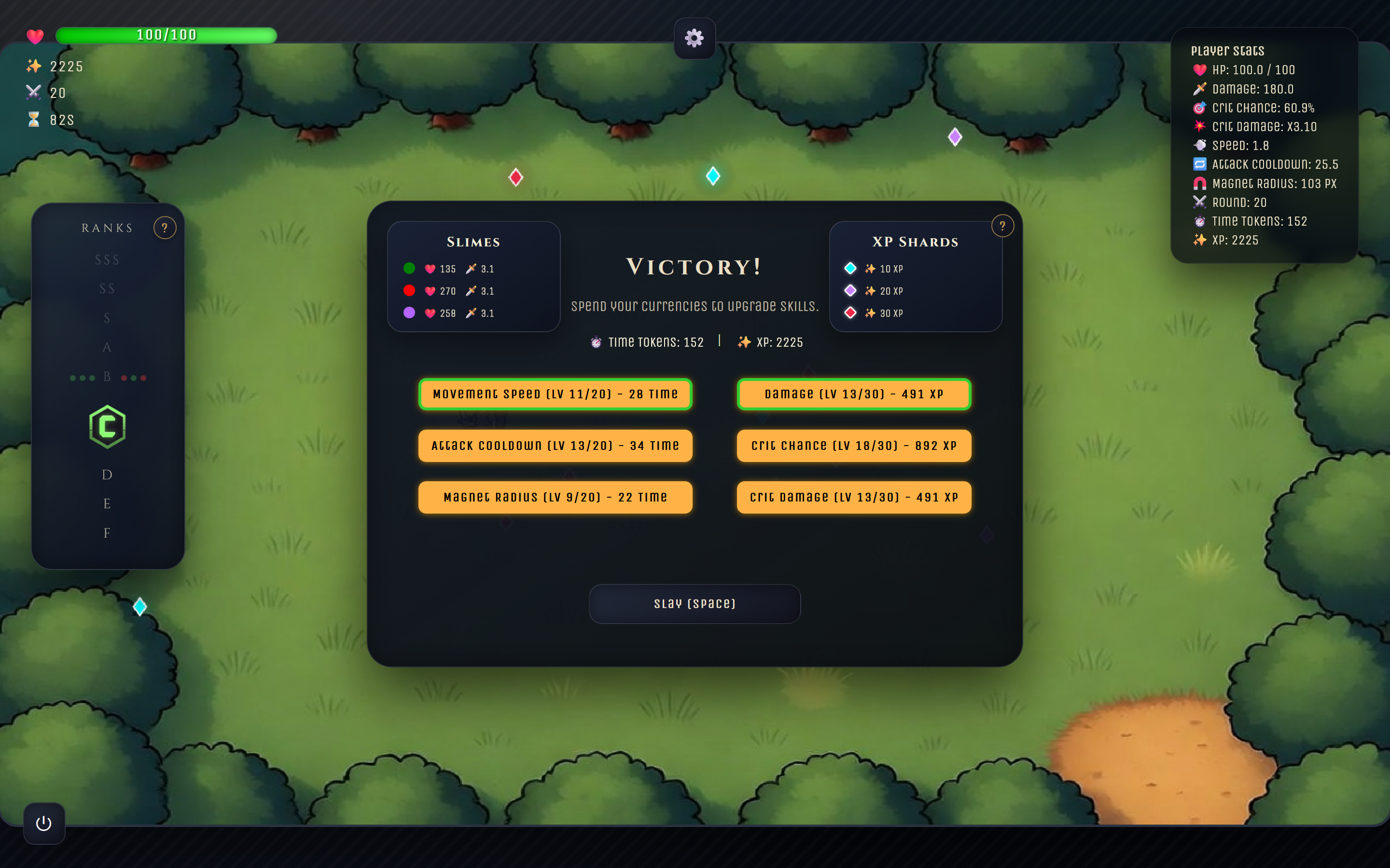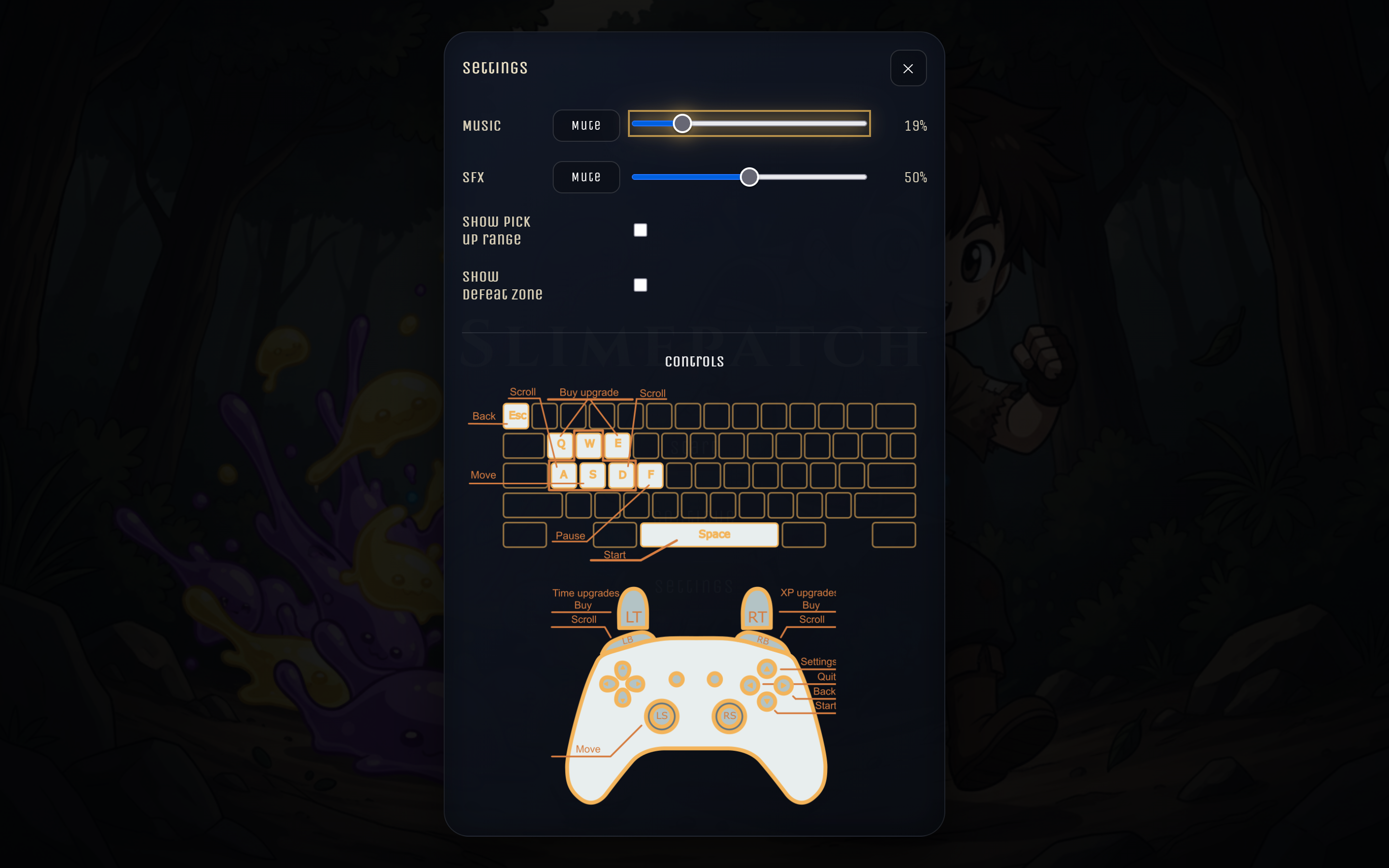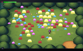 Fight through escalating rounds of colorful slimes, collect resources, and improve your skills between battles. Each round gets a little tougher, but so do you.